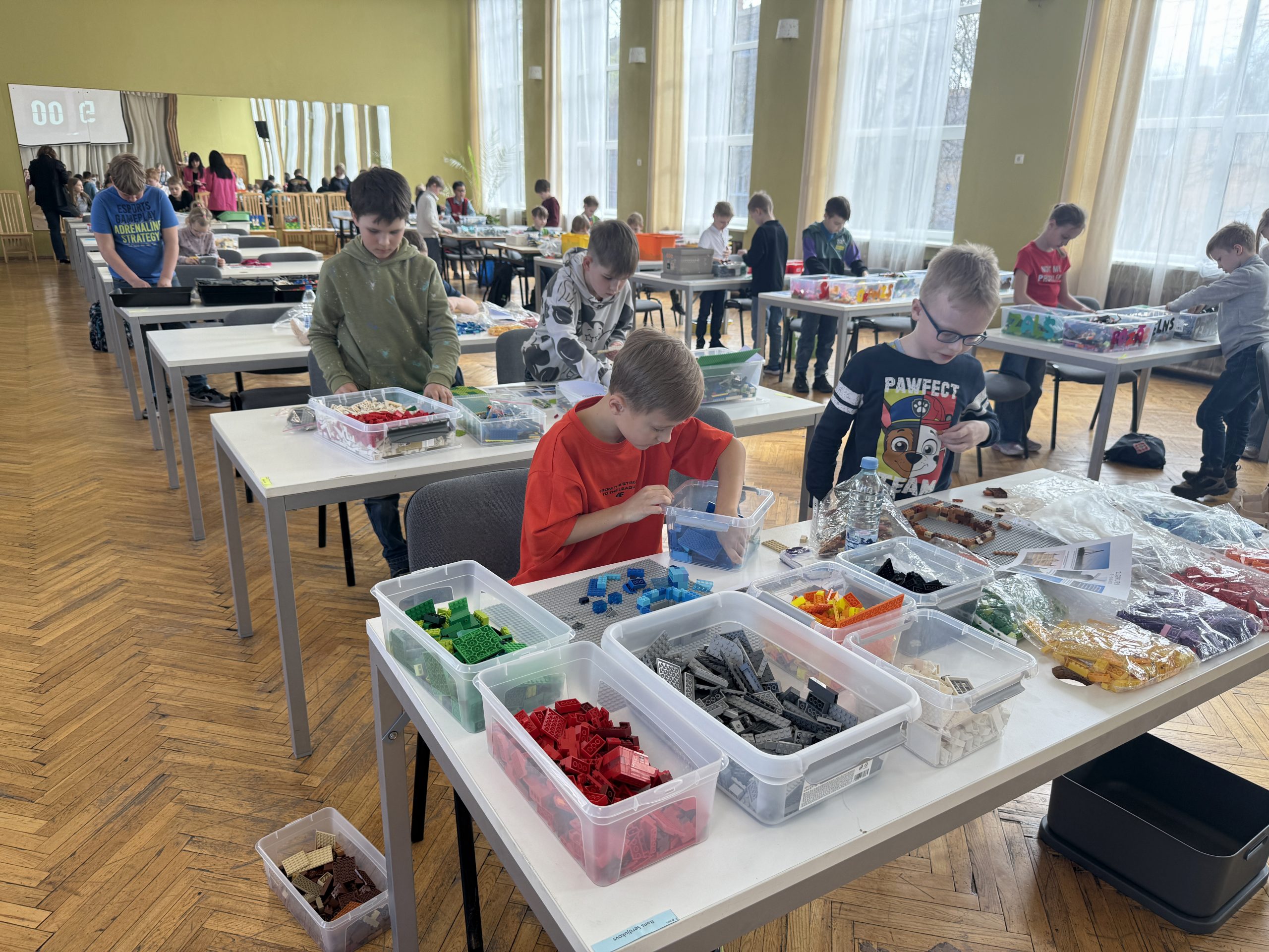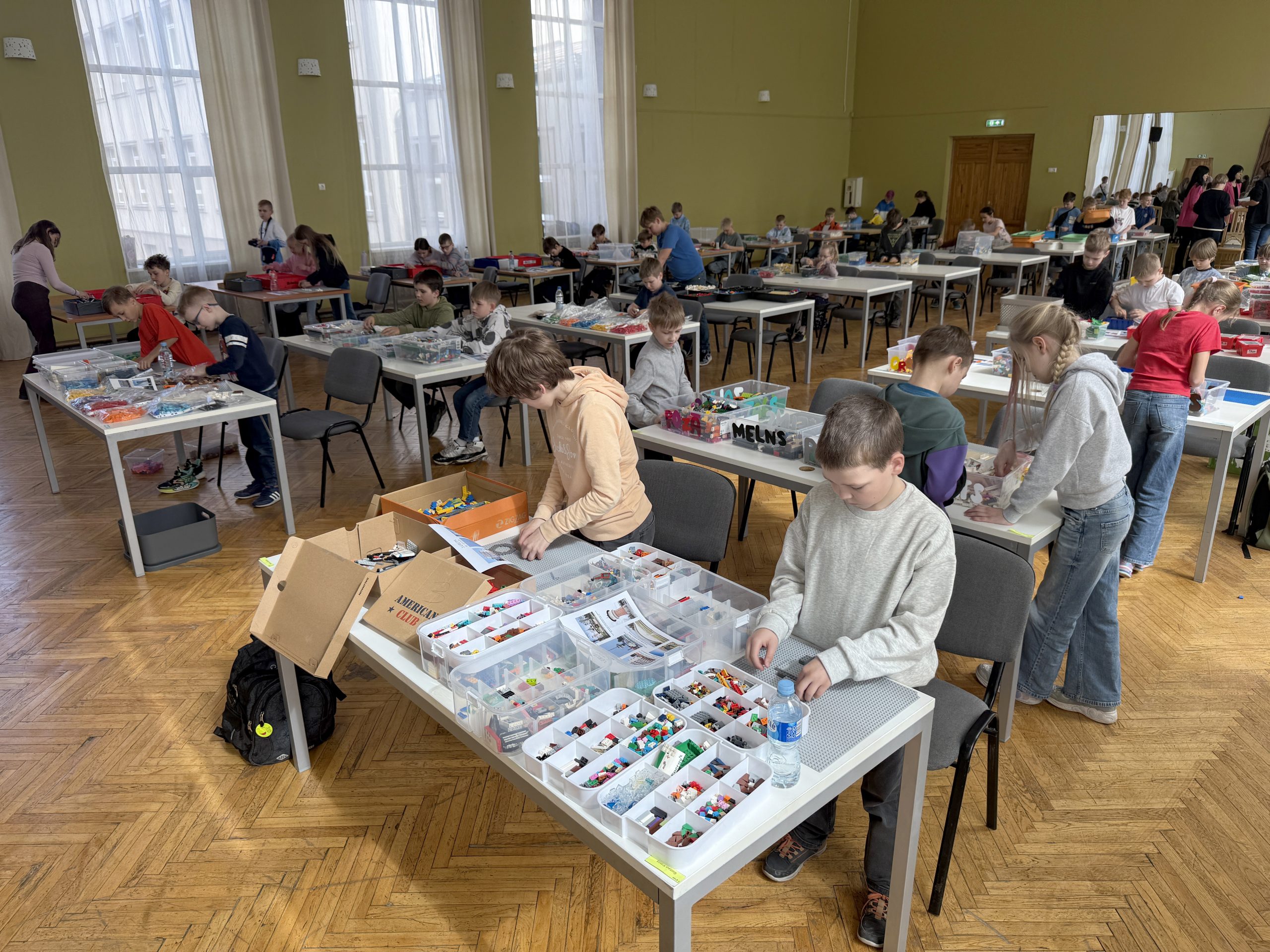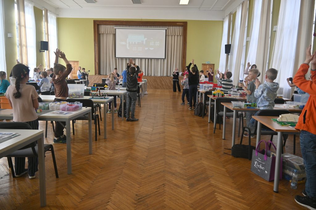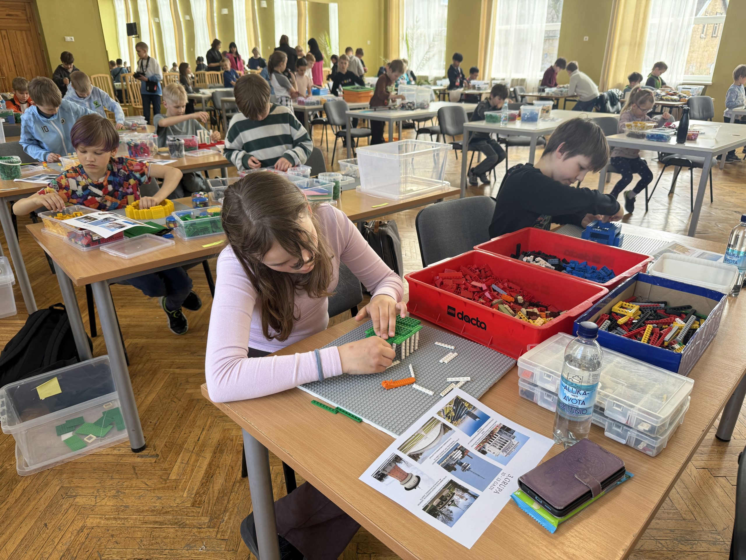 Klātienē darbojās skolēni no 7 līdz 13 gadiem, divās vecuma grupās: katrai grupai bija doti sešu dažādu būvju attēli un katrs izvēlējās vienu, kuru būvēt. Ja pirmsskolas grupā varējām redzēt celtnes no visas Latvijas, tad skolēniem šoreiz izvēlē bija Rīgas būves. Šie darbi tapa telpiski. Stundas laikā skolēni radīja gan Saules akmeni (Swedbank ēku), gan Mežaparka estrādi, gan Vanšu tiltu, gan Bišumuižas muižas ēku, gan kultūras pils “Ziemeļblāzma” parka tējas namiņš.